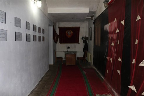 Ein Gitter im Hinterzimmer soll wohl eine Zelle symbolisieren. An der Wand hängen allerdings keine Bilder aus den Gulags, sondern von den Kämpfen zwischen Russland und Georgien im Jahr 2008, als die Kämpfe um Südossetien auch in der Region Gori ausgetragen wurden. Georgier werden hier als Opfer präsentiert, nicht als Täter.