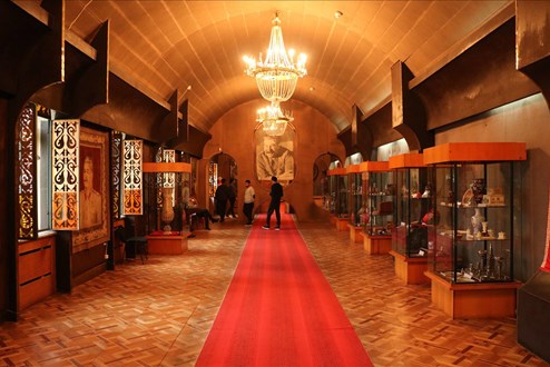 Ein sakraler Raum mit einer Totenmaske Stalins und Bildern von dessen Begräbnis und eine Ansammlung diverser Staatsgeschenke von Keramikvasen mit Stalins Bildnis bis zu einem kleinen Panzer in Gold, runden die Schau ab.